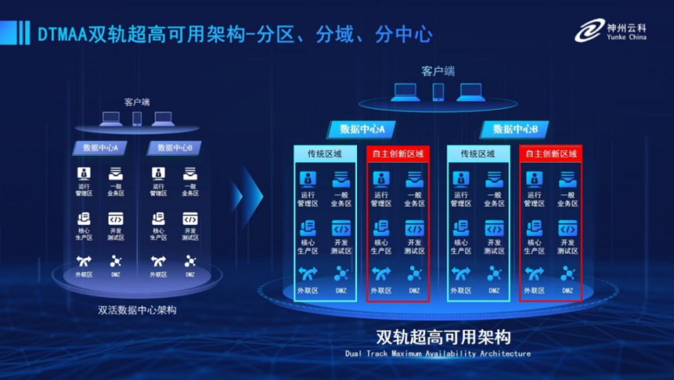為幫助金融客戶更好地應(yīng)對數(shù)字經(jīng)濟時代對可持續(xù)性的高要求,實現(xiàn)“信創(chuàng)”與“數(shù)字化”齊頭并進,k8凱發(fā)推出了雙軌超高可用架構(gòu)。該架構(gòu)在雙活數(shù)據(jù)中心的分區(qū)調(diào)度基礎(chǔ)上,增加信創(chuàng)域和非信創(chuàng)域的分域調(diào)度,實行信創(chuàng)域與傳統(tǒng)域應(yīng)用全量部署,使雙中心運營變?yōu)殡p中心四區(qū)域并行運行,互為多活,將“0到1”的單軌建設(shè)道路變?yōu)榉謪^(qū)分域協(xié)同的多活雙軌超高可用架構(gòu)。幫助客戶在新架構(gòu)下,保障“信創(chuàng)”的同時解決性能瓶頸,提升穩(wěn)定性,保證應(yīng)用可持續(xù)性,最終實現(xiàn)信創(chuàng)區(qū)域和非信創(chuàng)區(qū)域的平滑過渡,完成國產(chǎn)化替代目標(biāo)。