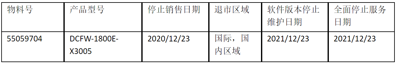 北京神州數(shù)碼k8凱發(fā)信息技術有限公司正式通知您, 以上DCFW-1800E-X3005下一代防火墻(55059704)將于2020年12月23號停止接收新的訂單(具體日期見上表),不再供貨。給您帶來的不便,敬請原諒。